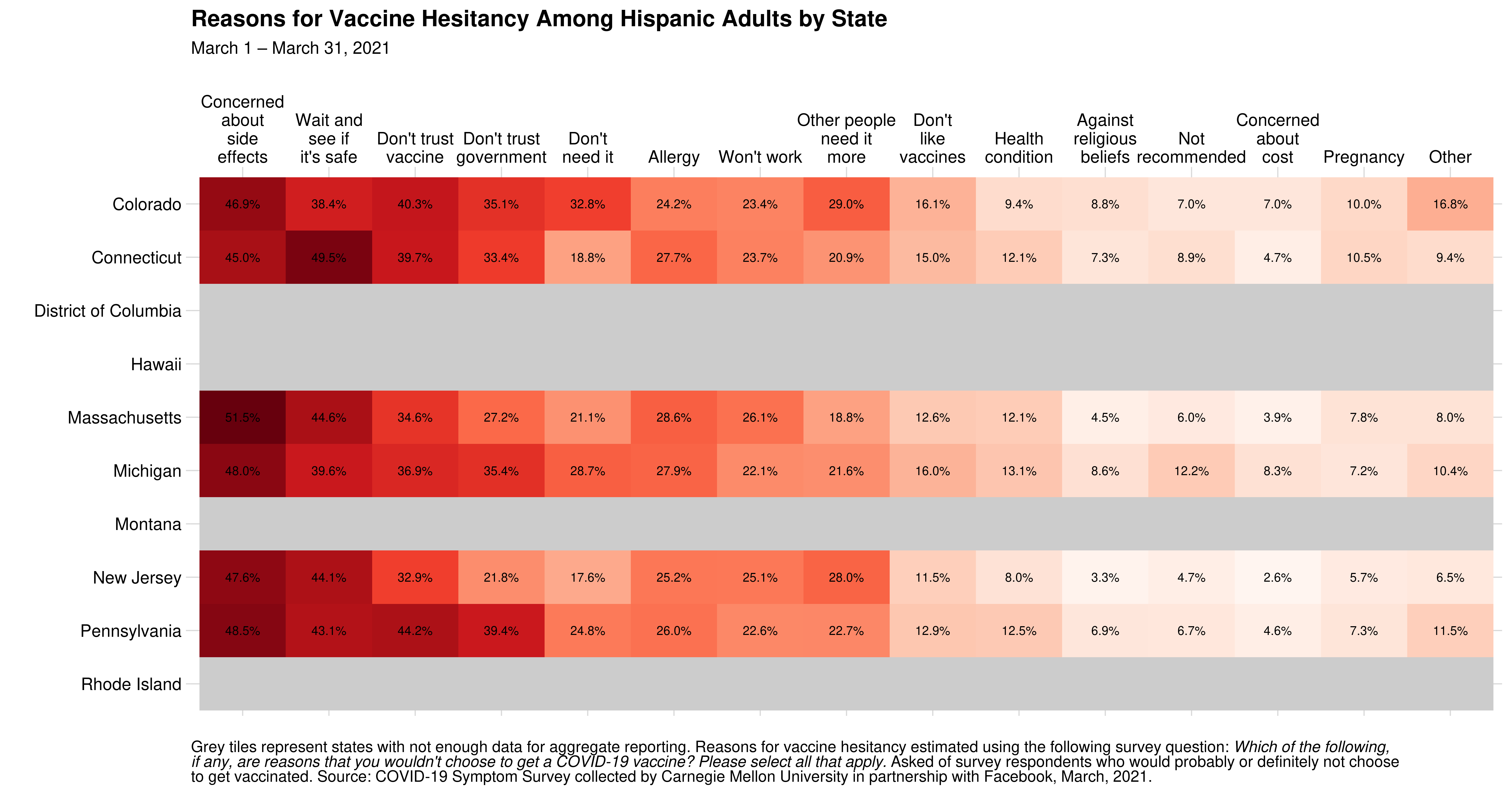 In states with the largest disparities in vaccine hesitancy between Hispanic and White adults (CO, CT, DC, HI, MA, MI, MT, NJ, PA, and RI), reasons for hesitancy among Hispanic adults are shown here: