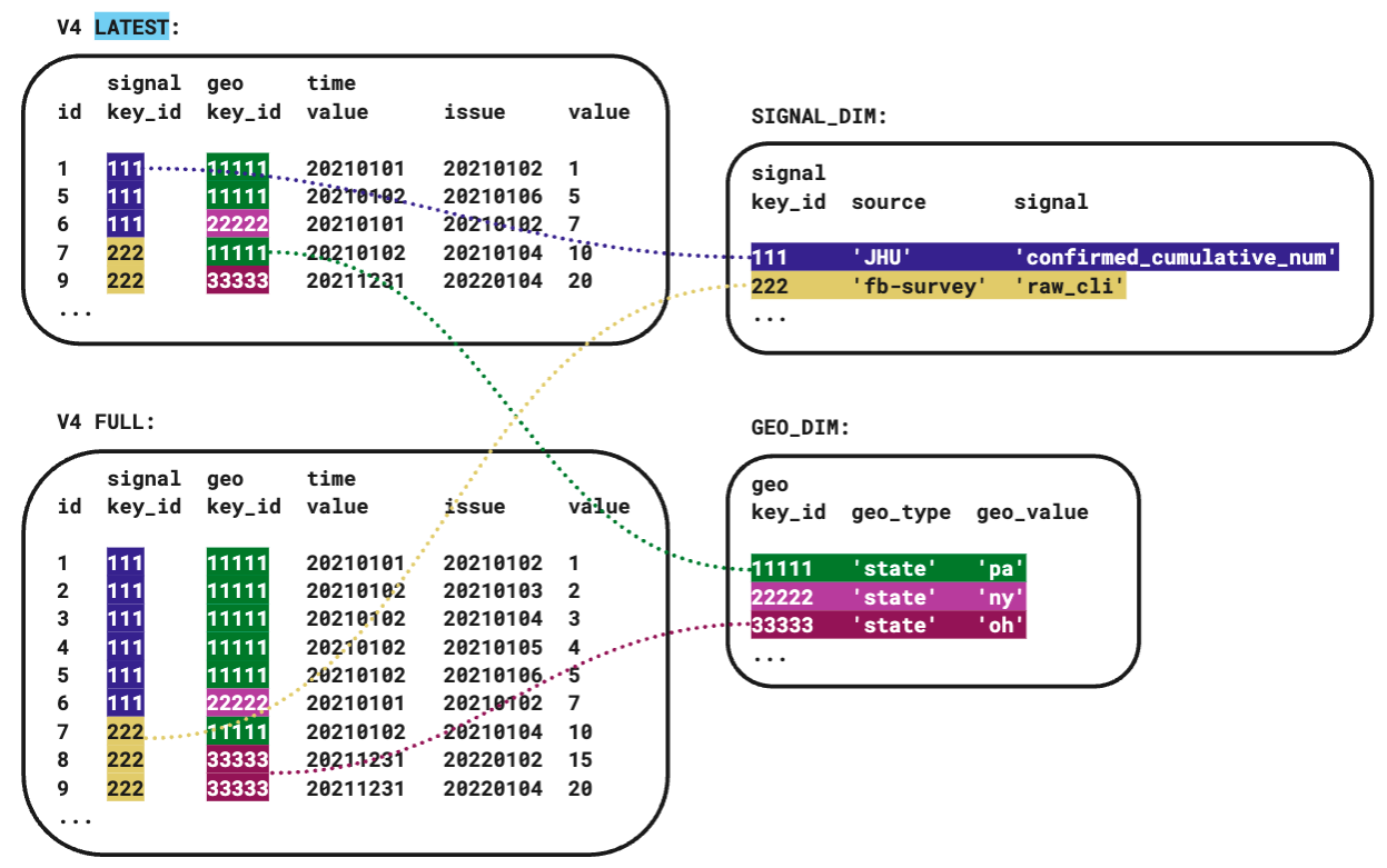 Epidata v0.4.0 (“v4” for short) launched on September 26, 2022, bringing about a major revision to how we store data served by the Epidata API. The changes prioritize fast access to the most up-to-date data while retaining the deep data revision history needed by researchers. The launch included a prototype of a modular data organization system intended to generalize across multiple pathogens, with stubs for more advanced and efficient timestamping and greater flexibility in data stratification.